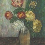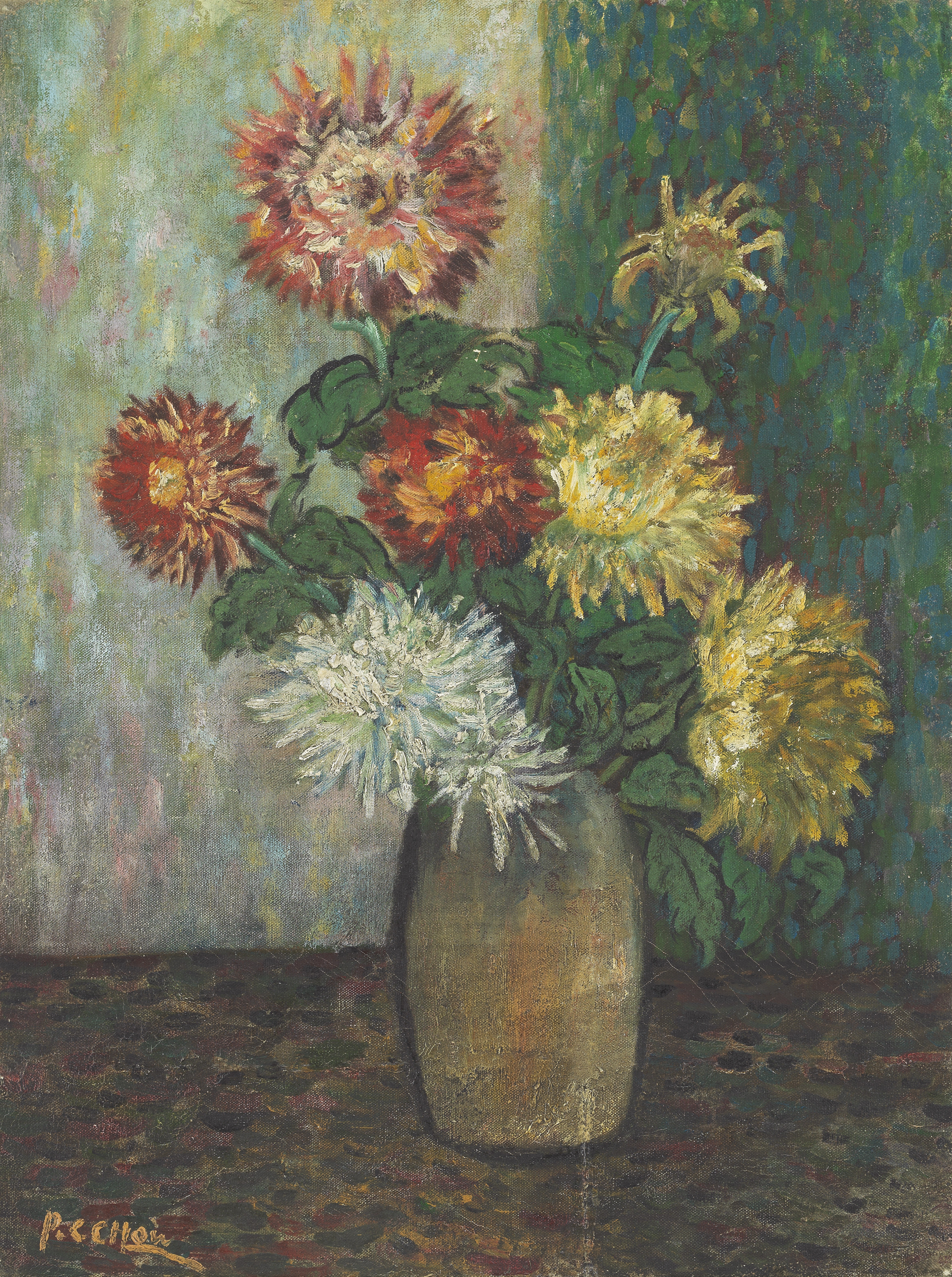 中国第一代留法艺术家周碧初,以对比强烈的色彩和传统山水点画笔法与西方点彩派技法的融合著称,毕生探索中西艺术的融合贯通。在20世纪40年代创作的《彩菊》中,他摒弃了西方传统油画的透视法,将画面分割为三个矩形色彩区域,花瓶置于色彩分界线上,三色的彩菊颜色姿态各异,打破了背景的严谨结构,笔触恣肆又富神韵,使画面既有静态隽永之美,又有鲜花灵动之姿,兼具结构和色彩的丰富性与统一性。