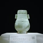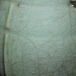 壶直口方唇,颈部较高,腹部呈方角椭圆形,颈、肩两侧附管状“贯耳”,壶身装饰有简练的扉棱纹、凹弦纹。通体施翠青色瓷釉,釉面满布大小不一、纵横交错的冰裂状开片,纹间闪烁点点金光。