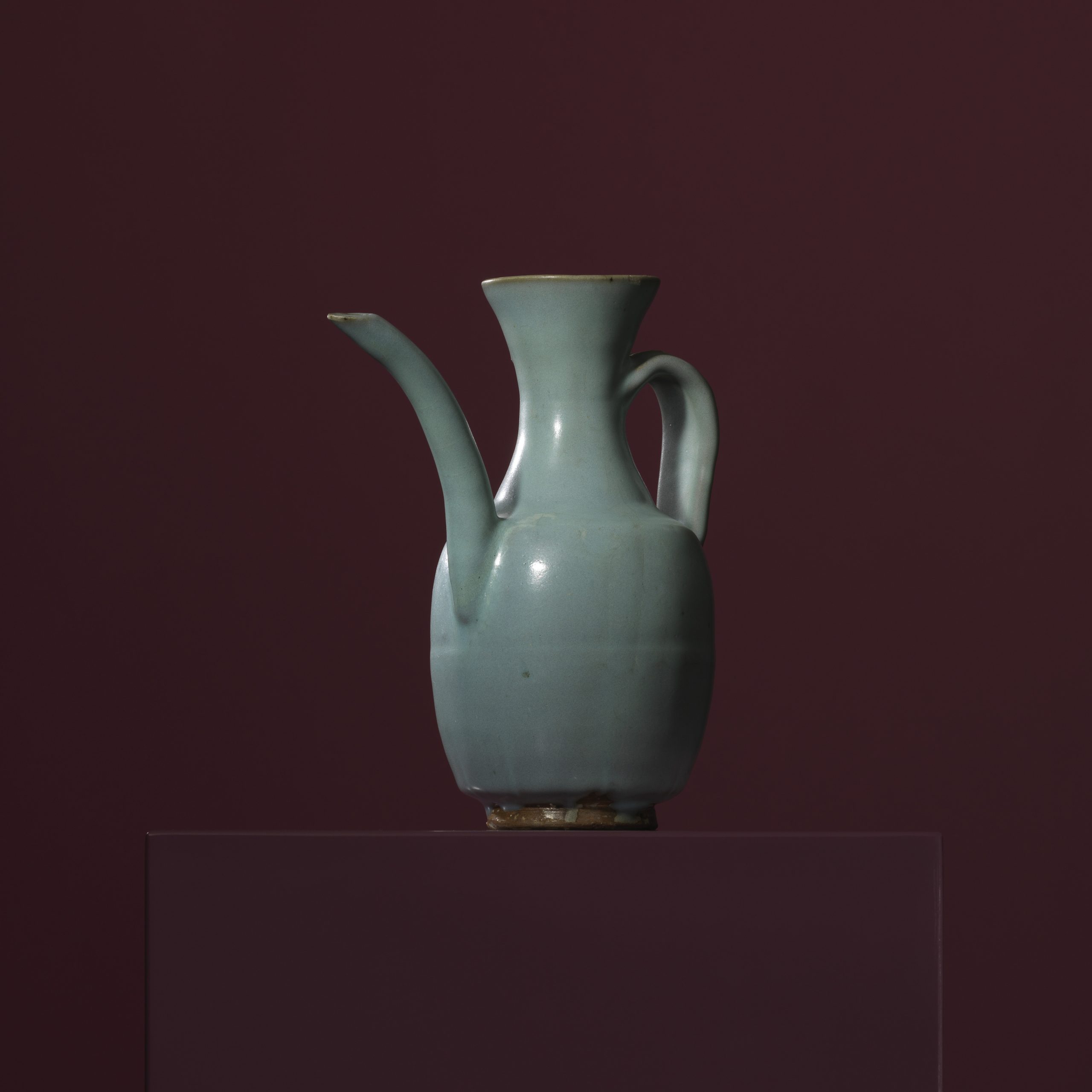 Potted with a flared mouth, a slender girdled neck, a sloping everted shoulder, and a bulging belly tapering down to the bottom, the ewer has a slim and elegant spout, protruding out upward and rising to parallel with the opening; the curved strip handle decorated with a ridge line in the middle, bulges on the top and is attached to the neck and the belly, like a man’s ear; the bottom is slightly converged and supported on a splayed foot ring. It is fully applied with sky blue glaze of crystal texture; the rim and the ridge line present a light brown colour due to its thinner glaze; while the joint areas and creases and grooves hold thicker glaze, so as to give an oily gloss; the foot bottom is neatly trimmed and left unglazed to expose its grey biscuit, yet the interior of the foot ring is also partially applied with glaze.