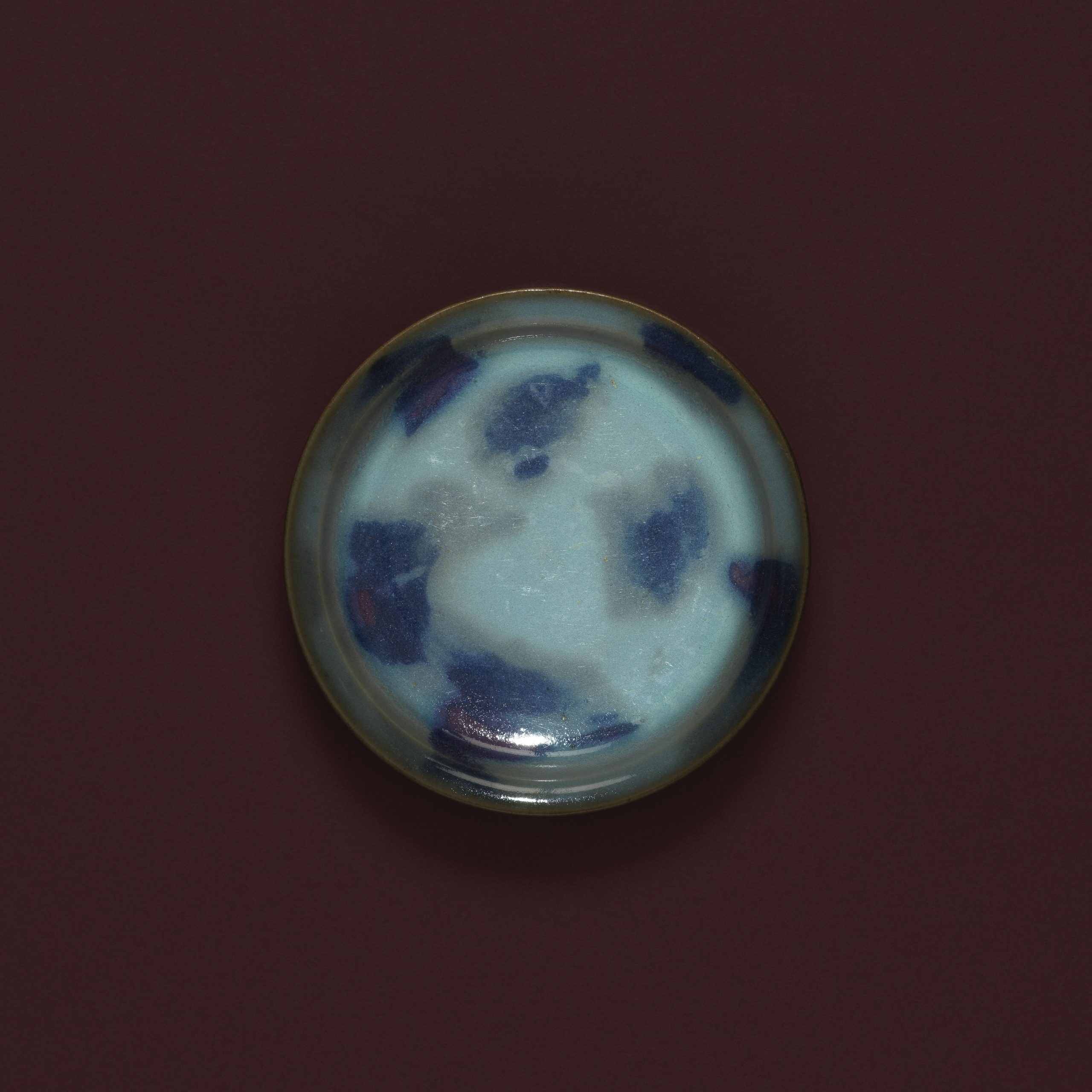 盘敞口折沿,弧腹较矮,平底,下承圈足。底足素胎,胎体呈灰白色,细腻坚实。通体施天蓝色瓷釉,釉面并有多块大小不一、边界不规则的紫彩花斑散布,逸趣横生,古朴雅致。