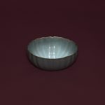 钵体敞口,作菊瓣状,筋脉凹凸相间,向下延伸至底缘,弧腹,平底微内凹,俯视如秋菊绽放。底部留有三个支钉痕,胎体呈灰白色,细腻坚硬。通体施天青色瓷釉,素雅温润。