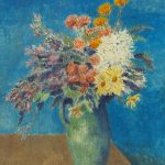 花卉贯穿毕加索艺术生涯的各个阶段,是他形式探索与媒介实验的重要载体。1904年的《瓶花》见证了他从忧郁冷峻的“蓝色时期”向温暖浪漫的“玫瑰时期”的过渡。这一转变很大程度源于他与人生首位重要缪斯——费尔南德·奥利维耶的相识相恋。此作正创作于两人相遇一个月后,蓝色依旧是背景与花瓶的主调,占画面近三分之一的赭色桌面却已带来温暖气息,粉、橙、黄、白、紫色花朵纷然浮现,弥漫出生机、诗意与梦幻的质感。