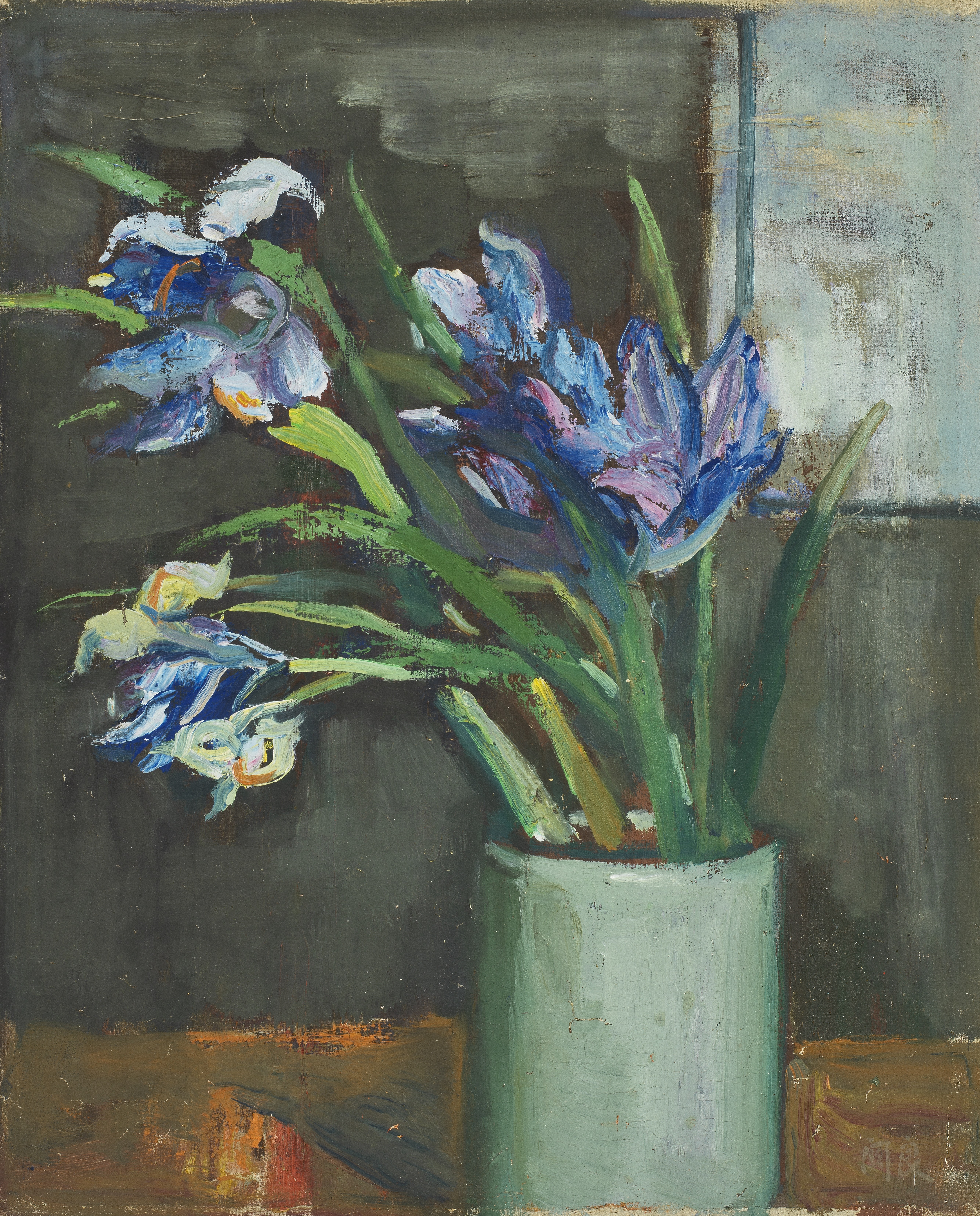 中国留日艺术先驱关良,是最早将西方现代主义绘画理念引入传统水墨的画家之一。这幅《鸢尾花》是他晚年成熟风格的典型代表。印象主义的启发以及数十年的水墨实践,令他以表现主义的色彩和功力精湛的笔法描绘花瓶中摇曳的鸢尾,在暗色背景中跃然而出,或盛放,或含苞,每朵花姿态不尽相同,在看似生拙的造型笔墨中,没有矫饰,一切都指向了“真”,将写意精神蕴于油画语言中,透出关良对生命、生活的内省。正如郭沫若所言,关良的作品“以西画作躯壳,国画作灵魂”。