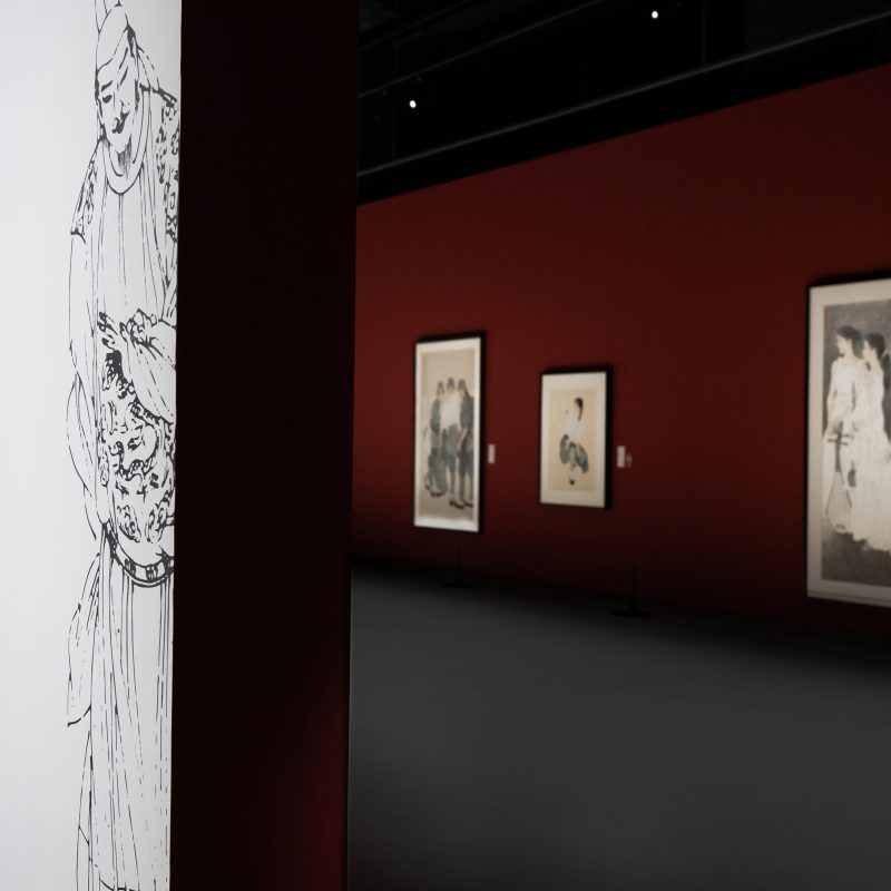 作为大众喜闻乐见的爱情题材,连环画《长生殿》有很多个版本,每个创作者都从自己的解读出发,用不同的画面风格讲述同一个故事。而高云在反复研读文字脚本后,决定以“宏大、华丽”为基调讲述这个发生在盛唐宫廷的故事。因此,在高云的《长生殿》中,我们既能看到宫殿楼宇、千军万马,也能看到雕梁画栋、珠光宝气。为了更精准地呈现时代,高云耗费半年时间,走访了诸多博物馆,进行了大量史料考证,才有了这些画面。《长生殿》与《罗伦赶考》一样,沿用了白描语言,但在艺术手法处理上却有所不同。《罗伦赶考》是发生在明朝的民间故事,故而画面线条多用曲线,轻松、自由。而《长生殿》则多用直线,以少量曲线点缀建筑的纹饰,以此彰显皇家的庄严与宏伟。