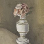 乔治·莫兰迪是20世纪意大利艺术的重要代表,其艺术生涯晚期专注于以瓶花为题的构图研究,《花》正是这一系列的典范之作。花瓶被置于画面中央,背景斜影在桌面与墙壁间勾勒出明确的空间结构。深暗的底色与花朵柔和的尘灰色调彼此映衬,营造出心理上的距离,削弱了物体的实用属性,使其脱离日常语境。自20世纪50年代起,莫兰迪以绢花和干花代替鲜花,将花卉这一日常物品升华为纯粹的体积与色彩,捕捉它们的形态和本质,将这一题材下的艺术实验推向了极致。