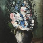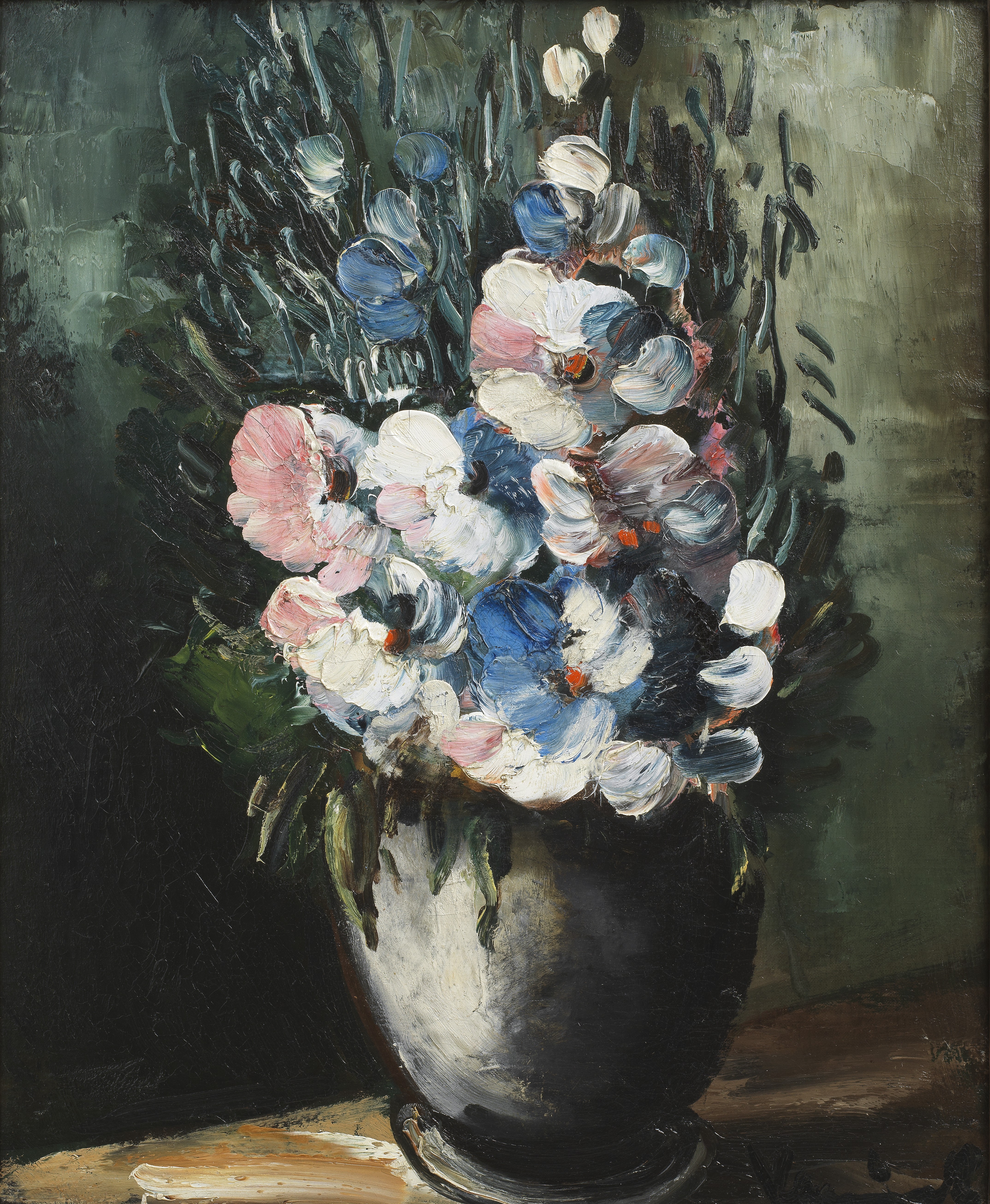 莫里斯·德·弗拉曼克同亨利·马蒂斯、安德烈·德朗并称为“野兽主义三杰”,以强烈的表现性用色与自觉的反学院姿态著称。其艺术历经转变:早期受梵高影响,色彩炽烈;约自1908年起,塞尚的启示使其色调转向深沉浓郁,风格也逐渐由纯粹的情感宣泄,转向兼顾结构理性与视觉张力的新阶段。这幅《灰色瓶花静物》体现了他风格转向后的探索。画面以幽暗背景衬托蓝粉相间的花朵,花瓣部分颜料厚重、肌理鲜明,微妙的晕染与色块间的冷暖对比,在理性构图中仍饱含表现力。