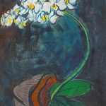 刘抗作为“南洋画派”的奠基人,将“书画同源”的中式艺术精神与热带风土中鲜活的原始趣味融为一体。《兰花》是其典型的南洋风格代表作。具有文人气质的兰花在热带阳光下生机盎然,不加修饰的笔触勾勒出花瓣轮廓,与曲折而富韧性的花茎、倾斜的花盆相互映衬,为画面注入蓬勃的生命动势。花瓣上明快的光色与干刷笔触渲染的墨蓝背景交相辉映,极为简洁的造型与直接的用笔呈现出质朴真率的美感,散发出生生不息的自然意趣。