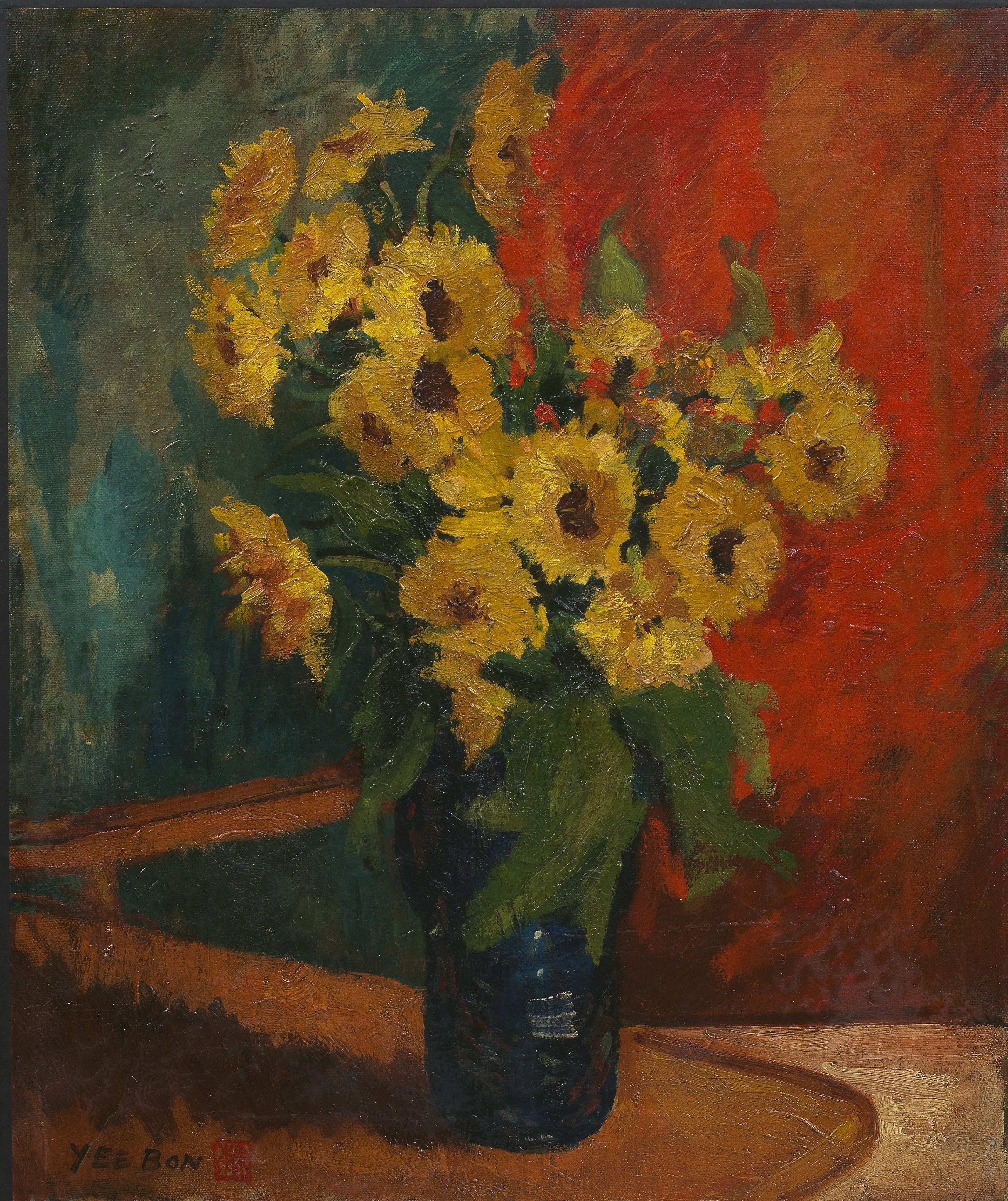 Yee Bon, a representative of the first generation of Chinese artists to study abroad from the Lingnan region and a pioneer of Western painting in Hong Kong, was known for works rich in the atmosphere of everyday life. In the 1950s, Yee returned to mainland China to settle, entering a new stage of artistic practice. By experimenting with ink painting, he deepened his understanding of traditional national art, making outstanding contributions to the nationalization of oil painting. Sunflowers, created during this period, depict a vase brimming with sunflowers in bold, passionate colours and vigorous brushstrokes. The work combines elements of classical Western oil painting with modern art. At the same time, the broad red–green contrast of the background blurs the flowers’ real setting, lending the piece a powerful visual impact and allowing intense emotion to surge from the canvas.