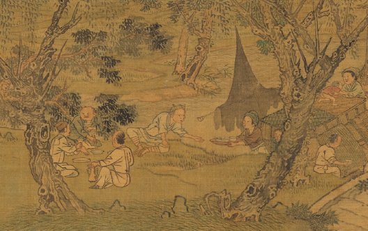 对于第三段的描绘,谢遂《金陵图》比杨大章与冯宁的版本约末短少一半,最明显的是少了渔人船上捕鱼的场景,以及结尾一片连绵水田。[ 赵琰哲亦指出这两本《金陵图》构图与内容十分接近,“只是杨大章在卷尾加入一段渔民捕鱼场景,这是谢遂本所没有表现的情节”。参见赵琰哲,《茹古涵今—清乾隆朝的仿古绘画研究》(南宁:广西美术出版社,2016),页35-36。]那么究竟哪一个版本,更接近佚失的《宋院本金陵图》原本面貌呢?