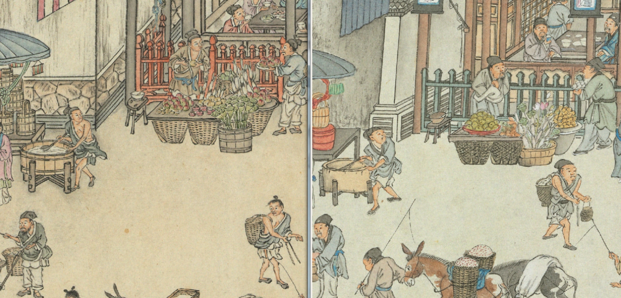 就整卷的人物表现来说,谢遂人物的衣着皆较端正,上身半裸的男性数量较少,甚少描绘衣物上的补钉痕迹,连杨大章版本可见的疑似拾荒者【图5】【图6】,或是桥上拄着柺杖靠演奏维生的视障乞人【图7】【图8】,谢遂都选择淡化处理或直接省略不画。